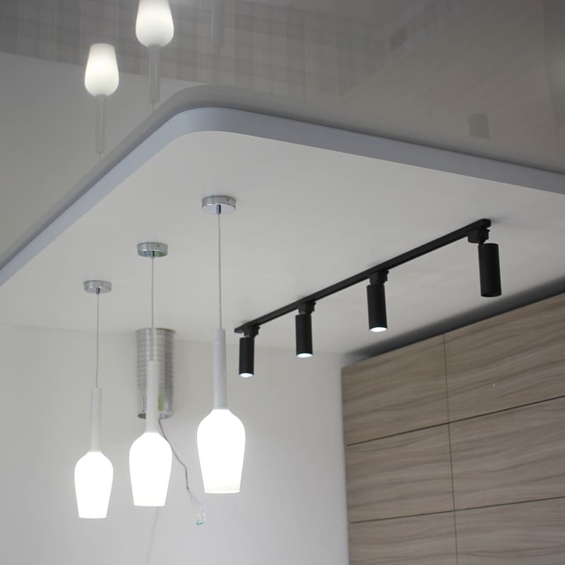 Для создания аккуратного потолочного пространства установили натяжные потолки. Они позволили скрыть неровности, коммуникации и придали помещению завершённый вид. Глянцевые, матовые или сатиновые полотна удачно вписались в общий стиль интерьера.
