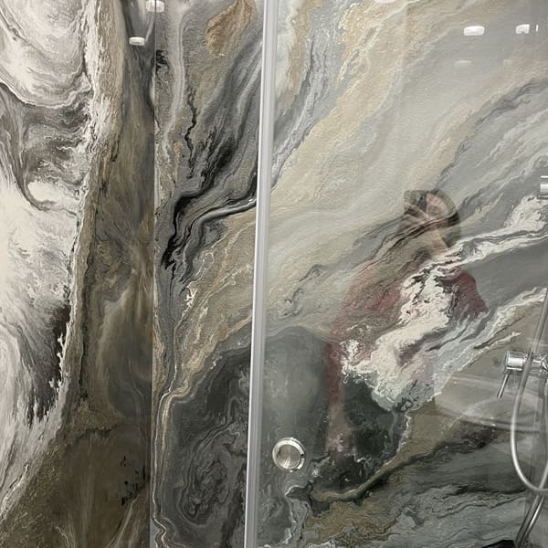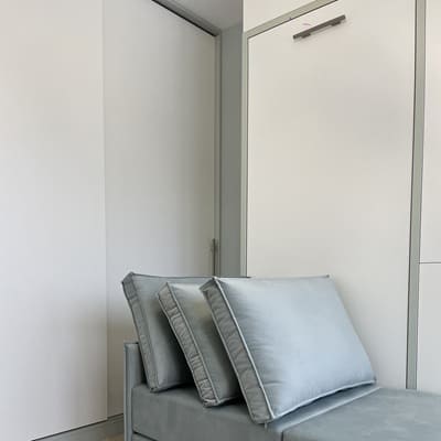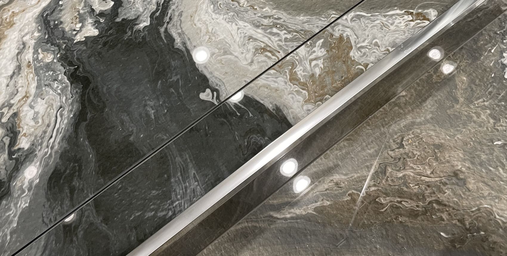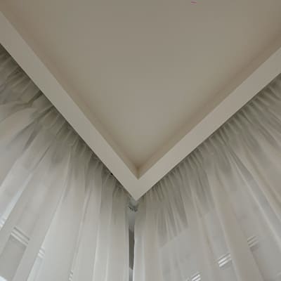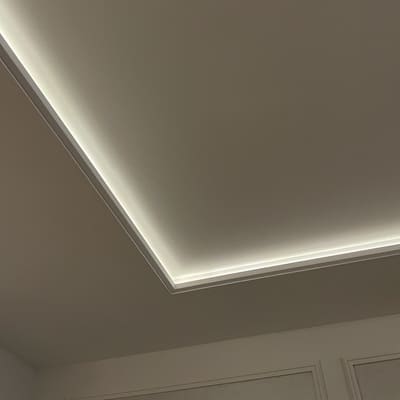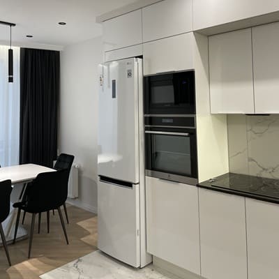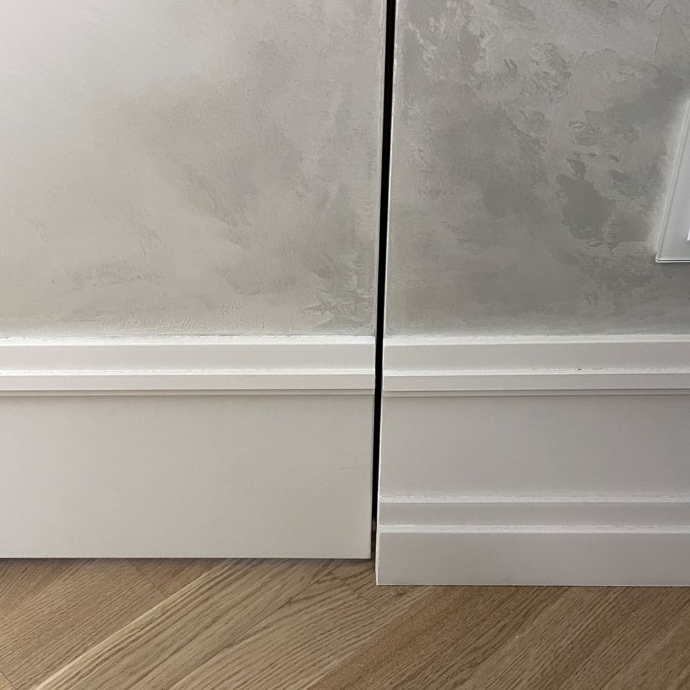 В санузлах проведена облицовка, а также выполнена покраска стен и потолков. Дополнительно нанесена декоративная штукатурка, установлены молдинги, уложена паркетная доска и смонтированы плинтусы. Также произведён монтаж розеток, выключателей, светильников и светодиодной ленты, установлена сантехподборка, а коробки и полотна скрытых дверей получили отделку и покраску.