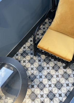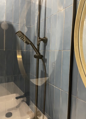 ?5. Изготовление душевого поддона и гидроизоляция Изготовили душевой поддон из керамогранита – материала, обеспечивающего эстетичный, прочный и долговечный результат при соблюдении всех норм монтажных работ. Обязательный этап — нанесение гидроизоляции, швы затирались эпоксидной фугой для гарантии долговечности.