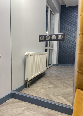 3. Штукатурные работы. Стены оштукатурены гипсовой штукатуркой по маякам с образованием идеальных углов в 90°. Стыки разнородных материалов проклеены фасадной сеткой, а на бетонное основание нанесён бетоноконтакт. Идеальные углы особенно заметны по премыканиям мебели к стенам. В санузлах стены оштукатурены песчано-цементной смесью с формированием углов 90°; перед укладкой плитки на стены и пол наносится гидроизоляция (с использованием ленты), а в стяжку предварительно врезается электрический тёплый пол. Качество штукатурных работ является основой для последующих этапов – премыкания плинтусов, установки мебели и укладки плитки.