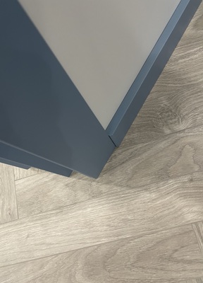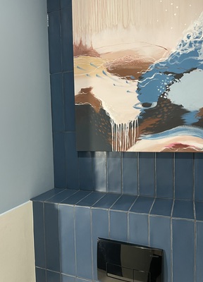 7. Облицовка санузлов Плитка мелкоштучная синего цвета тоньше крупноформатного керамогранита, потому под мелкоштучную стену наращивали, чтоб была в одну плоскость с фоновой крупноформатной плиткой. Столешница в ванной изготовлена из керамогранита, для нее из арматуры делали каркас, заливали бетон.